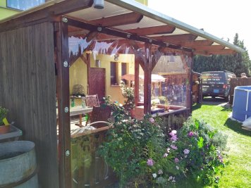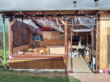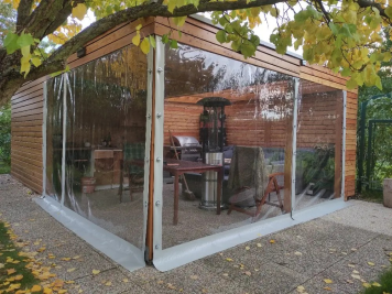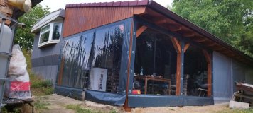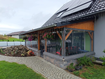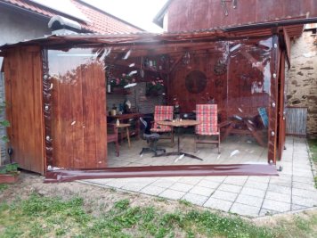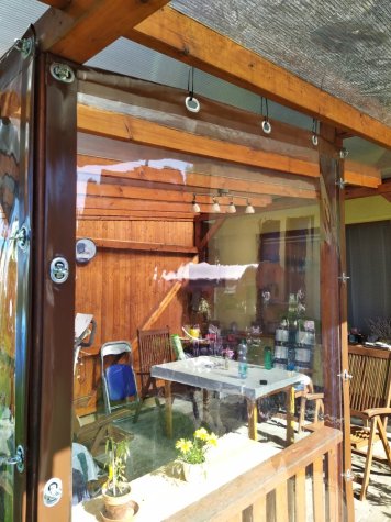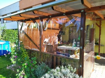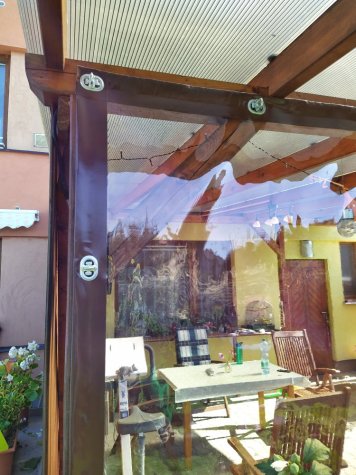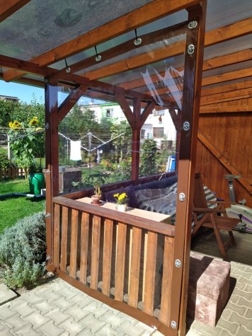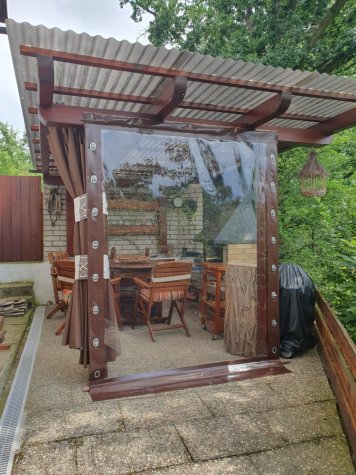 Zástěna na pergolu může být vyrobena z průhledné PVC fólie 1mm silné, nebo kašírované folie bílé 250g/m2 nebo kašírované mléčné 140g/m2 (lehká varianta).